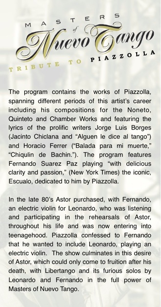 Masters of Nuevo Tango is a production which has an ensemble of 9-10 musicians, 2 singers and 1 dance couple and offers two distinct programs: